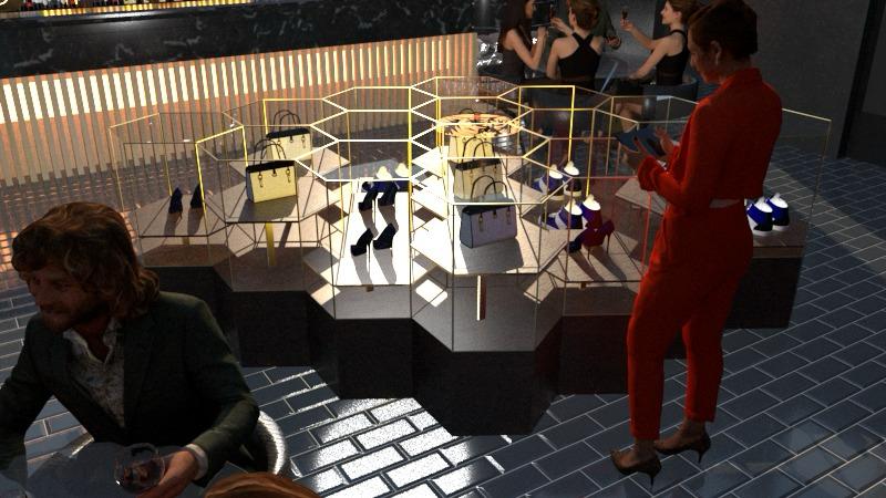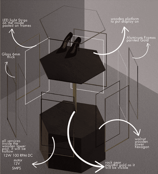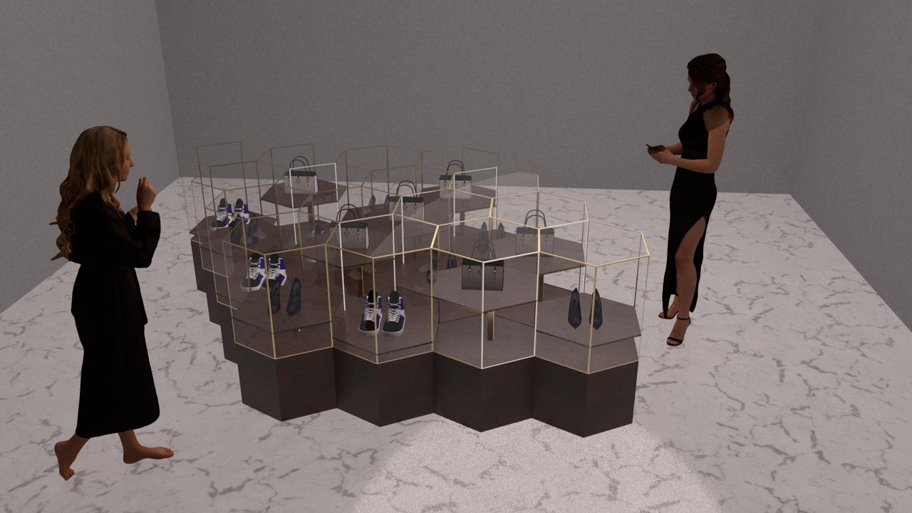 ELEVATE breaks this limitation. It turns everyday accessories into captivating, moving centerpieces. At its core is a dynamic platform that rhythmically moves up and down, bringing items like shoes or jewelry to life. The hexagonal, tessellated structure adds a modern geometric aesthetic, making it an immersive display piece rather than just a shelf.
